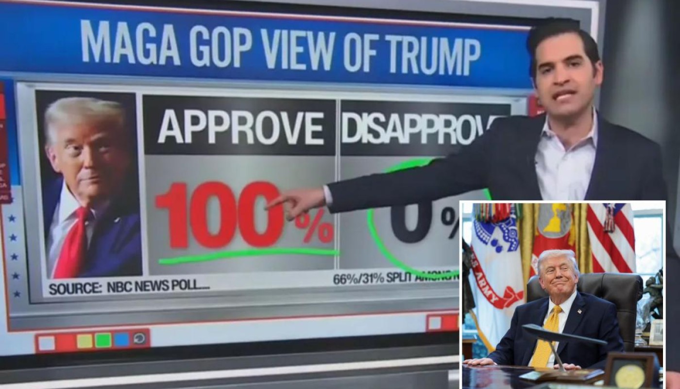 “A veces, uno mira los datos de las encuestas y hay cifras que saltan a la vista, y esta es una de ellas”, dijo Enten, al tiempo que destacaba una encuesta de NBC News que mostraba el índice de aprobación del 100% de Trump entre los republicanos que se identifican como “MAGA”.